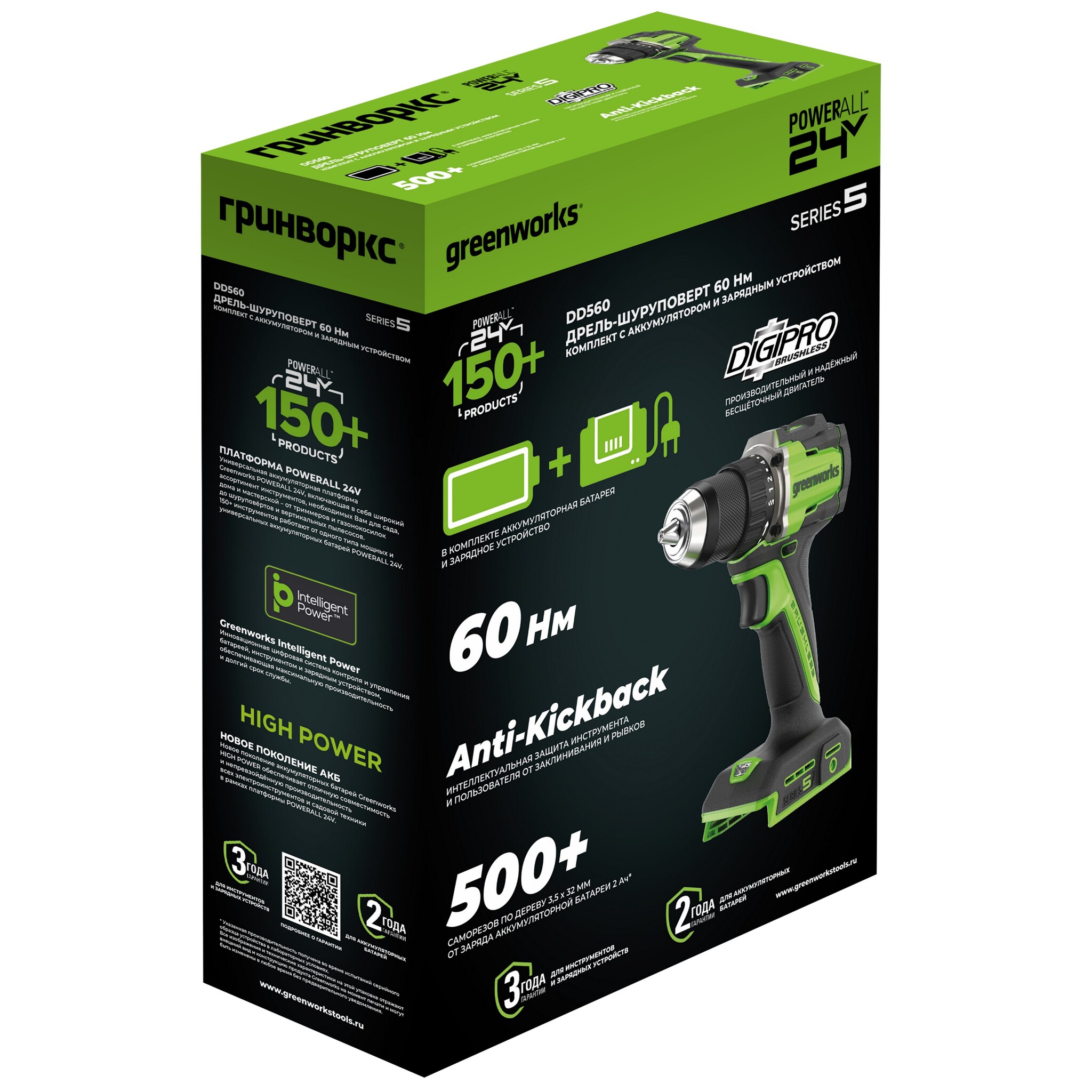 Дрель-шуруповерт аккумуляторная Greenworks DD560 (24В, 2хАКБ 2Ач и ЗУ) 3708407CUC