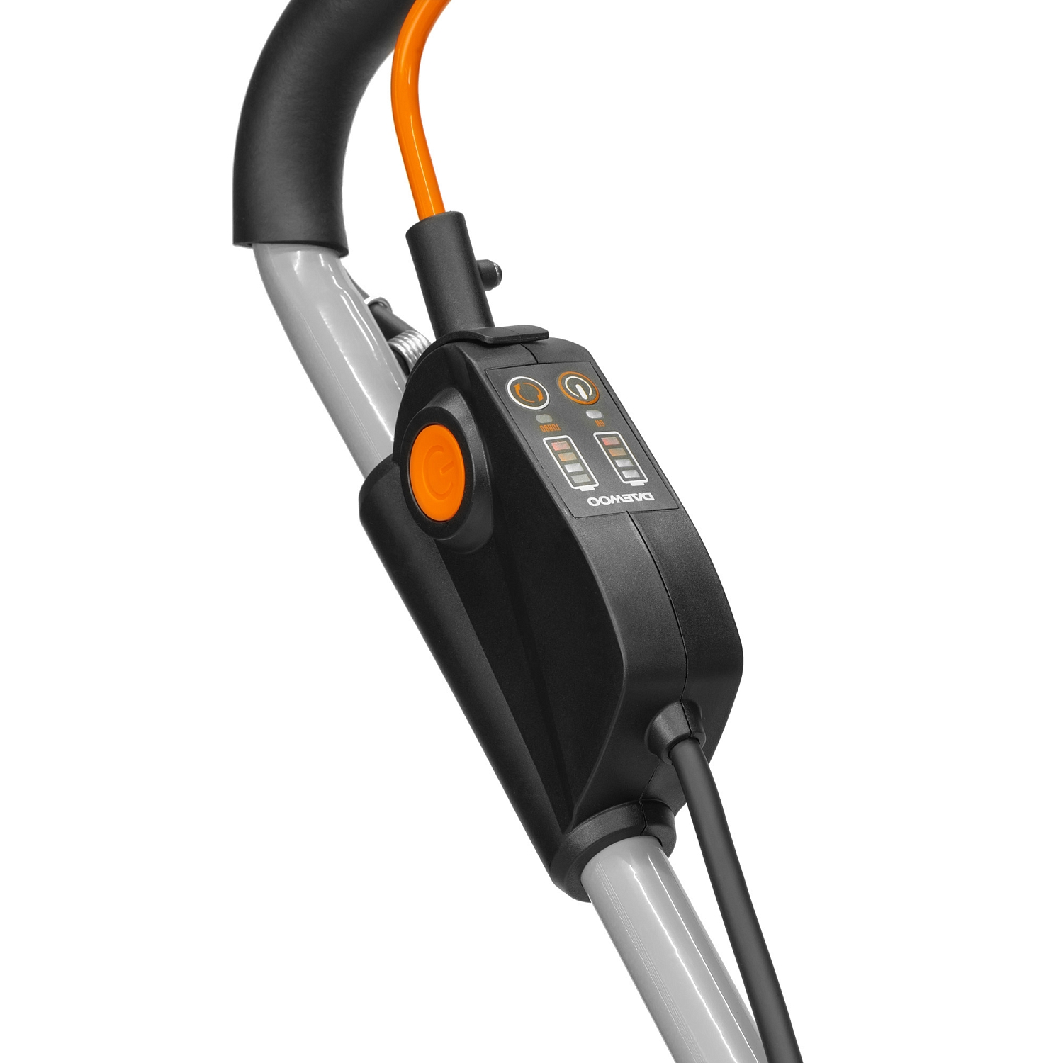- Электронная панель управления. Эргономичная панель на рукоятке управления позволяет включать и выключать газонокосилку и контролировать уровень заряда каждого аккумулятора.