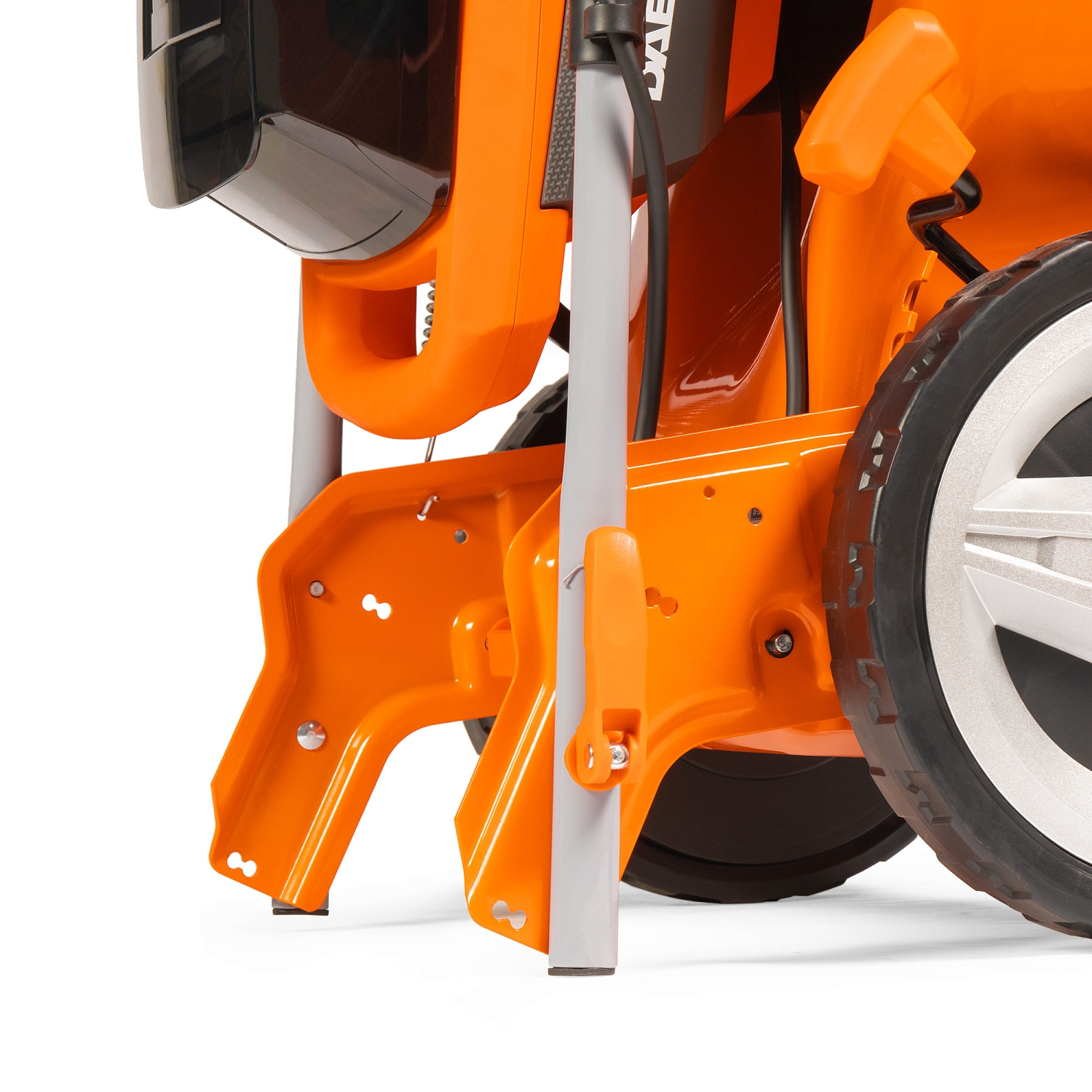 - Вертикальное хранение. Специальная конструкция корпуса и складная рукоятка позволяют компактно хранить газонокосилку в вертикальном положении.