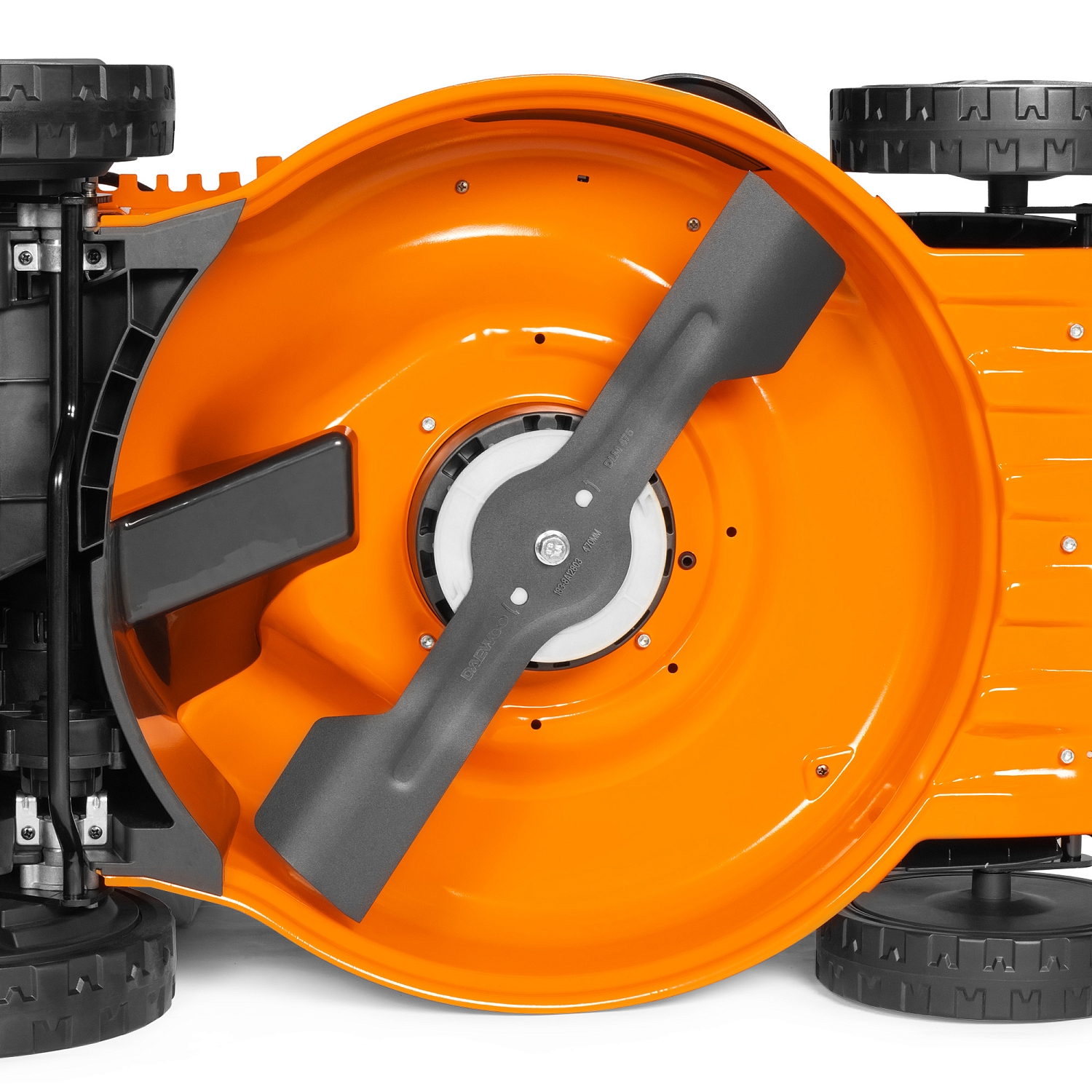 - Колеса увеличенного диаметра. Колеса увеличенного диаметра на подшипниках позволяют косилке легко работать даже на неровных участках и иметь хорошее сцепление с поверхностью. Закрытая внутренняя часть колес предотвращает попадание травы и грязи внутрь механизма колеса.