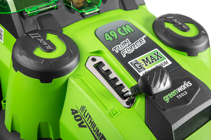 Газонокосилка аккумуляторная Greenworks, TwinForce, 40V, 49 см, без АКБ и ЗУ - конструкция, заметно отличающаяся от устройств подобного класса.