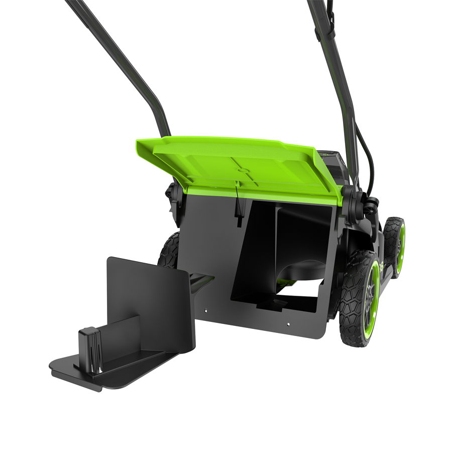 - Комбинированный травосборник с жесткой верхней частью, оснащенной индикатором заполнения, и мягкой складной нижней частью для удобства хранения.