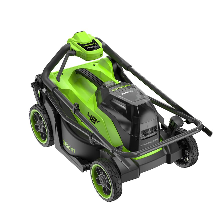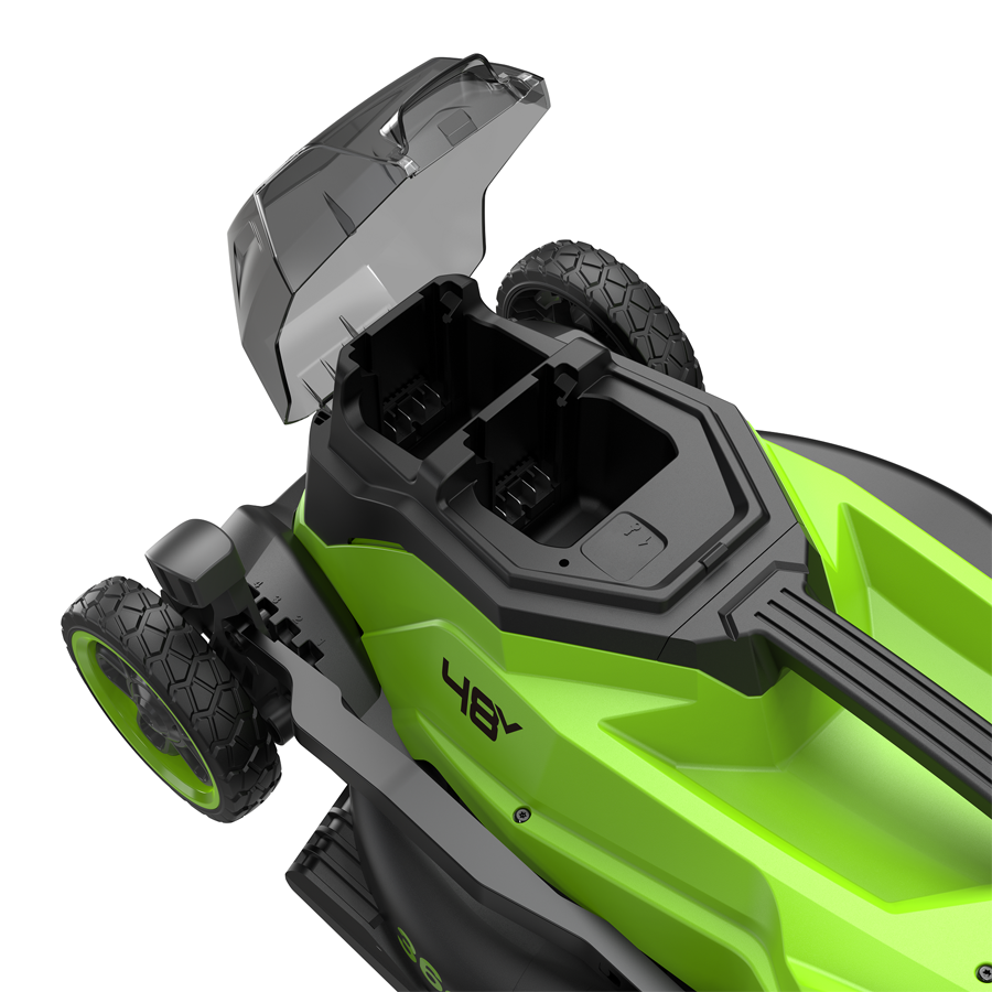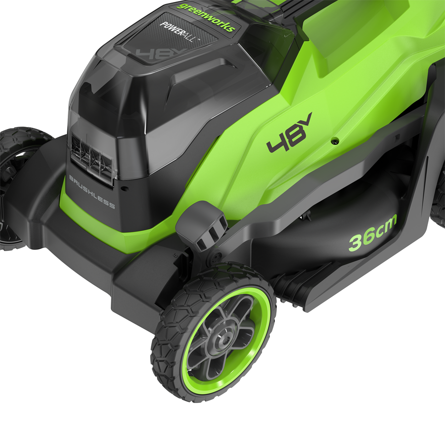 Газонокосилка аккумуляторная Greenworks 48V (2х24V) GD24X2LM361- работает одновременно от двух аккумуляторов 24V, обеспечивая суммарное напряжение 48V. Это решение значительно увеличивает мощность по сравнению с моделями на 24V.