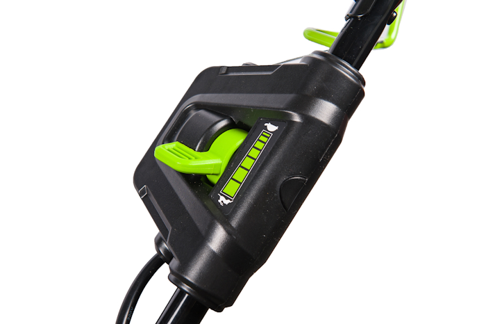 Дополнительный предохранитель защищает двигатель от механических повреждений при попадании ножа на твердый предмет. Время автономной работы - 60 минут или до 600 м² от 4 А*ч батареи. Косилка оснащается ключом безопасности для предотвращения от случайных включений. Оптимально для территории: 600 - 1200 м2.