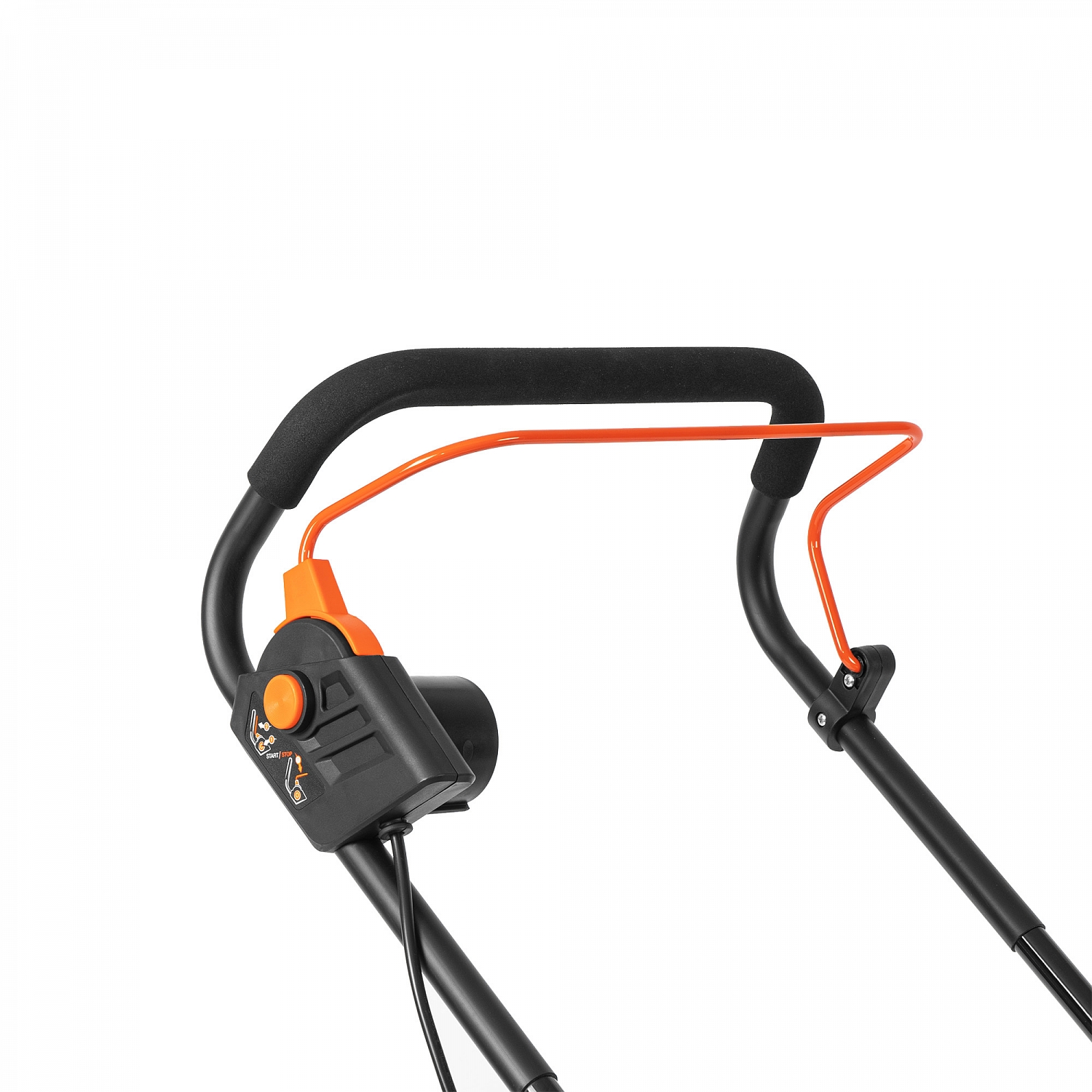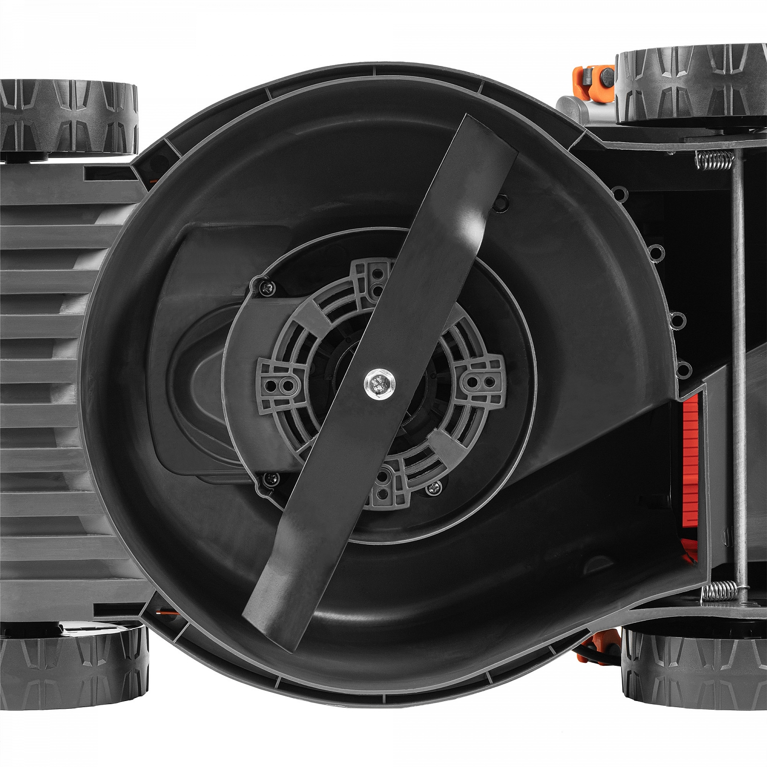 Корпус газонокосилки сделан из ABS пластика и обладает высокой прочностью. Он легок, устойчив к влаге и безопасен.