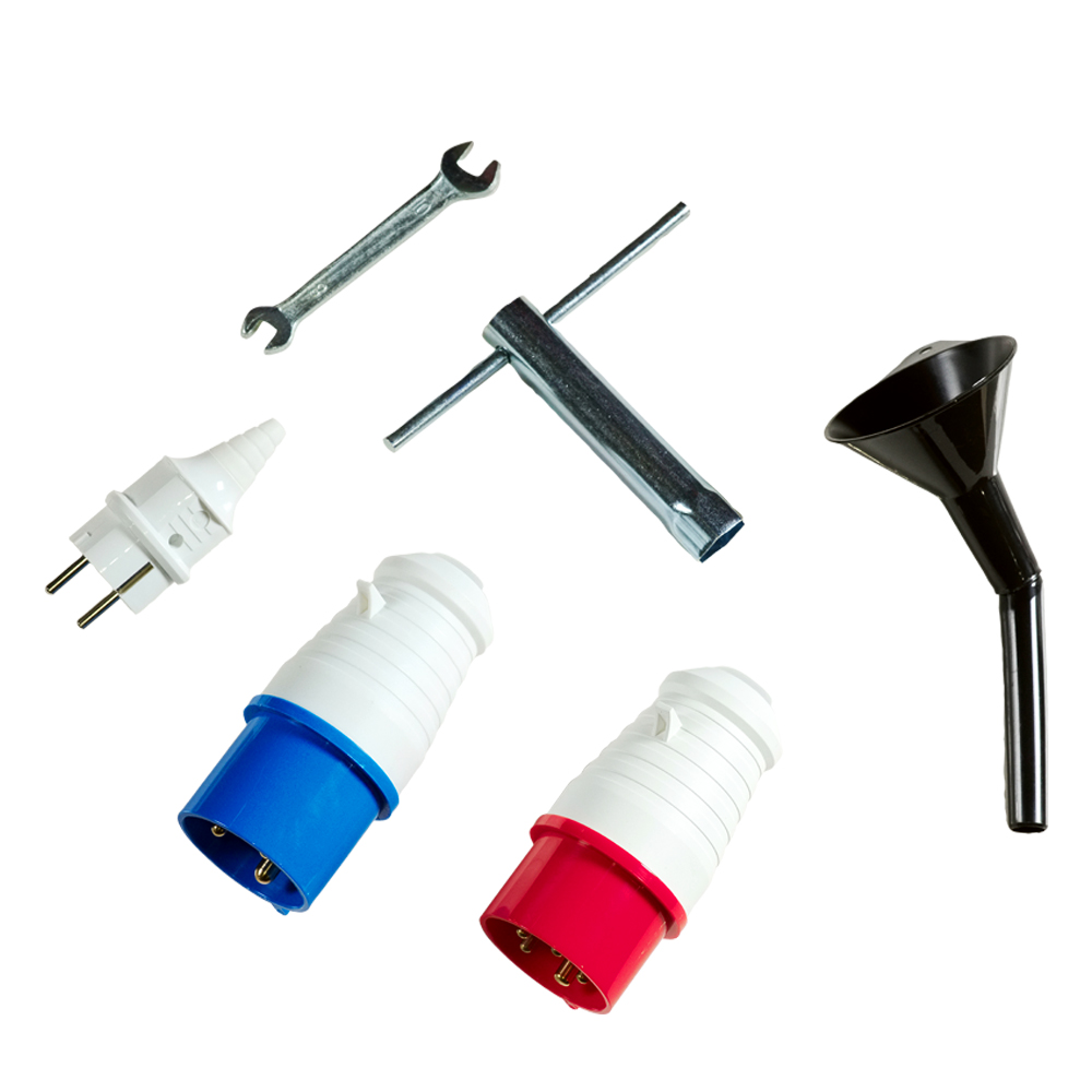 Генератор: Вилка 230В/32А; Вилка типа евро 230В/16А: Вилка 400В/32А: Свечной ключ с воротком: Ключ рожковый 8/10 мм: Ключ зажигания — 2 шт.: Резиновые опоры с крепежом (установлены на генераторе) — 4 шт.: Воронка для залива масла. |
