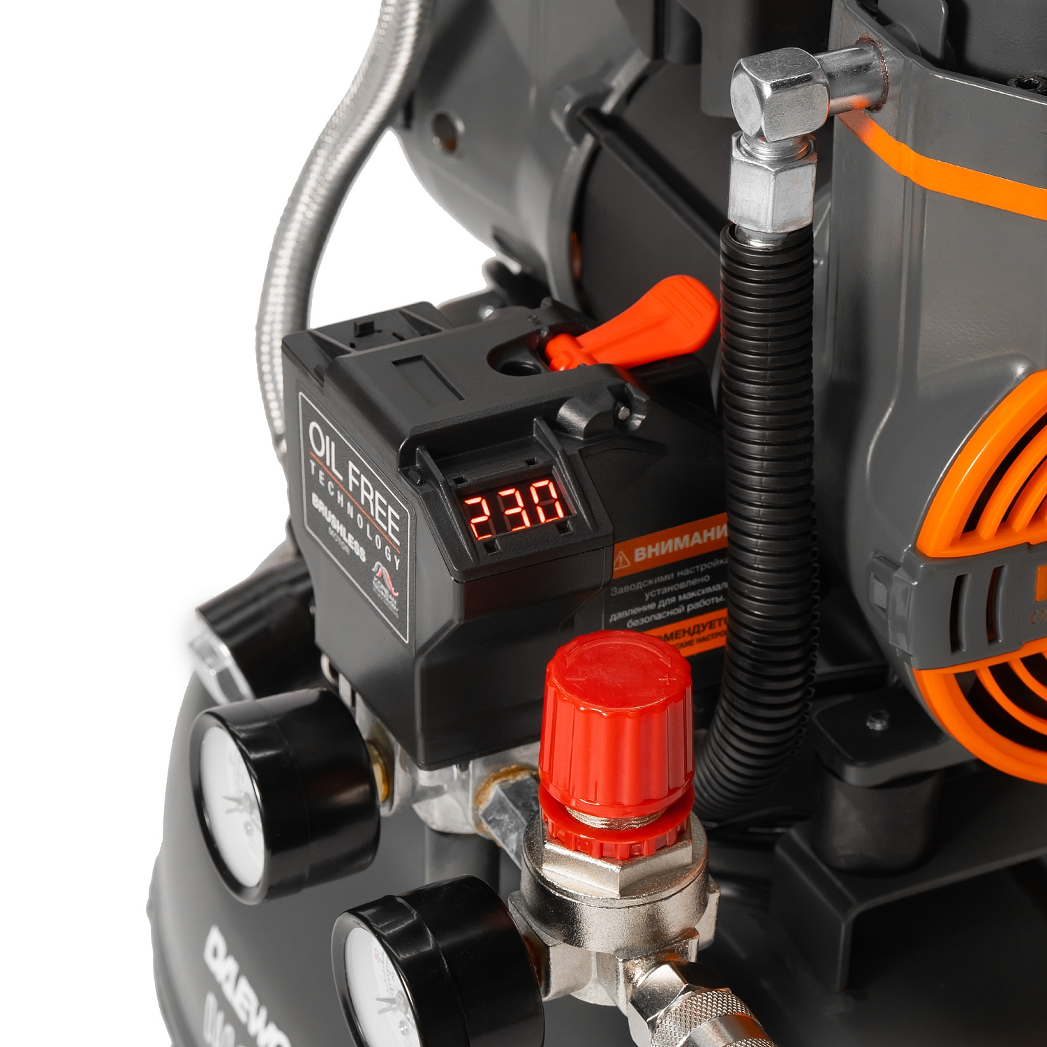 Двигатель имеет низкий уровень вибрации и не требует сложного технического обслуживания, обеспечивая долгий срок службы и надежность компрессора. Конструкция компрессора исключает потребность в замене масла, что значительно упрощает техническое обслуживание и сводит к минимуму затраты на эксплуатацию оборудования. Два больших радиатора вкупе с мощным вентилятором эффективно и оперативно охлаждают устройство даже при интенсивной эксплуатации. Антивибрационные опоры надёжно фиксируют компрессор на поверхности, снижают шум и вибрацию, продлевая срок службы техники и повышая комфорт использования.