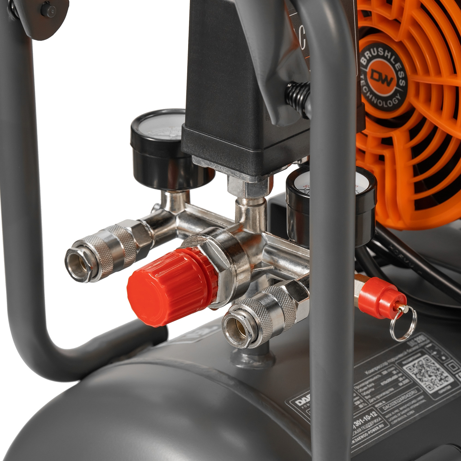 Бесщеточный электрический двигатель Daewoo защищен от перегрузок и перегрева. Обеспечивает бесшумную и эффективную работу и гарантирует производительность до 320л/мин. Двигатель имеет низкий уровень вибрации и не требует сложного технического обслуживания, обеспечивая долгий срок службы и надежность компрессора. Конструкция исключает потребность в замене масла, что значительно упрощает техническое обслуживание и сводит к минимуму затраты на эксплуатацию оборудования. Два больших радиатора вкупе с мощными вентиляторами эффективно и оперативно охлаждают устройство даже при интенсивной эксплуатации. Антивибрационные опоры электродвигателя снижают уровень вибрации, обеспечивая плавную работу компрессора и продлевая срок службы. Предохранительный клапан срабатывает при достижении давления в ресивере в 9 бар. Электромагнитный клапан автоматически сбрасывает давление в магистралях после выключения компрессора. Защита от перегрузки срабатывает при слишком низком или высоком входном напряжении, отключая аппарат.