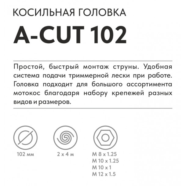 Косильная головка A-Cut 102 подходит как для бытового, так и для профессионального использования, рассчитана на кошение травы разных типов. Может устанавливаться на аккумуляторные и сетевые триммеры, маломощные мотокосы, совместима со всеми типами триммерных струн. Фиксируется с помощью металлического резьбового крепления.