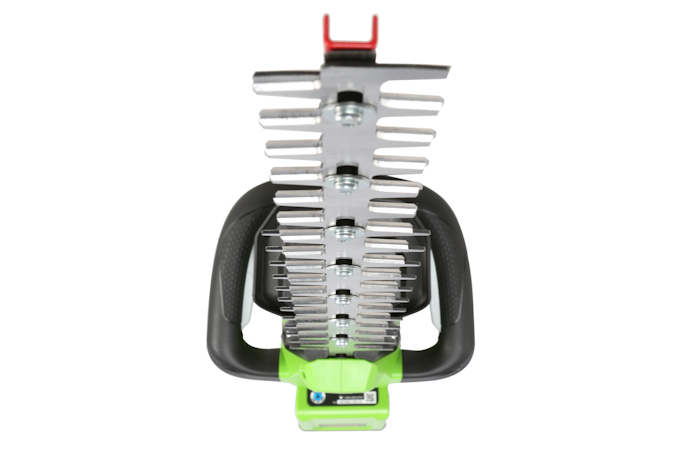 Кусторез оснащен поворотной рукояткой с углом поворота 90°. Лезвие длиною 61см с алмазной заточкой, шаг среза 27 мм. Эта модель имеет вес 2,7кг, обладает низким уровнем шума и вибрации, а также эргономичным дизайном рукоятки. Автономное время работы составляет до 70 минут от 4 Ач батареи. К преимуществам аккумуляторной техники можно отнести отсутствие необходимости использовать бензин и масло, тянуть за собой провод, отсутствие вредных выбросов и загрязнений.