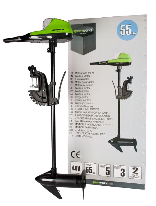 Лодочный мотор Greenworks G40TM55 40В - уникальная модель электрического лодочного мотора, которая работает от аккумулятора 40В, совместимого с более чем 25 устройствами серии G-MAX 40В. Одной из важных особенностей является компактный размер и малый вес — всего 9 кг. А также пониженное количество шума по сравнению с бензиновым, что позволяет походить к рыбе не пугая ее. Эта модель станет отличным выбор для любителей троллинговой ловли, так двигатель позволяет передвигаться с небольшой скоростью — оптимальной для для такой ловли рыбы. Электротяга составляет 25 кг, максимальная скорость 4,83 км/ч. Время автономной работы от 4 А/ч аккумуляторной батареи составляет 22 мин., но важно помнить что с собой можно взять несколько аккумуляторов, что было бы затруднительно с мотором работающим от 12В автомобильного аккумулятора. Управление производится удобным телескопическим румпелем. Навесное крепление подходит почти ко всем лодкам с транцем.