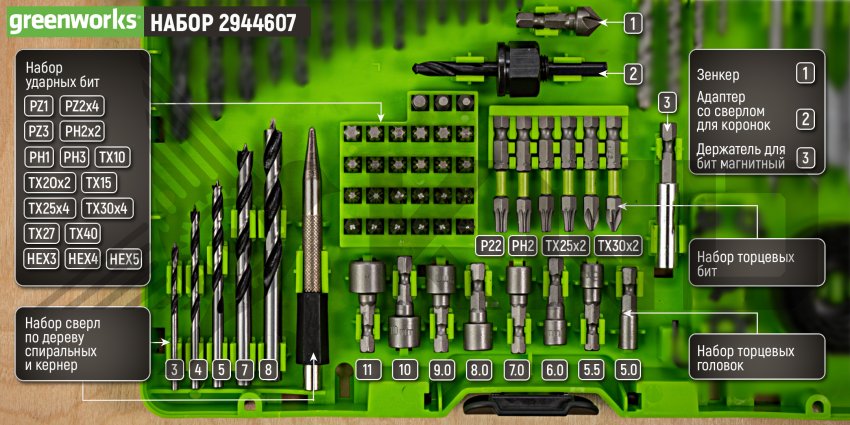 Набор сверл, бит и коронок Greenworks в кейсе, 90 предметов 2944607
