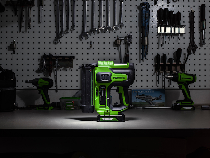 Нейлер аккумуляторный Greenworks 24V, предназначен для декоративных и отделочных работ. В качестве оснастки подходят гвозди длиной от 19 до 50,8 мм.