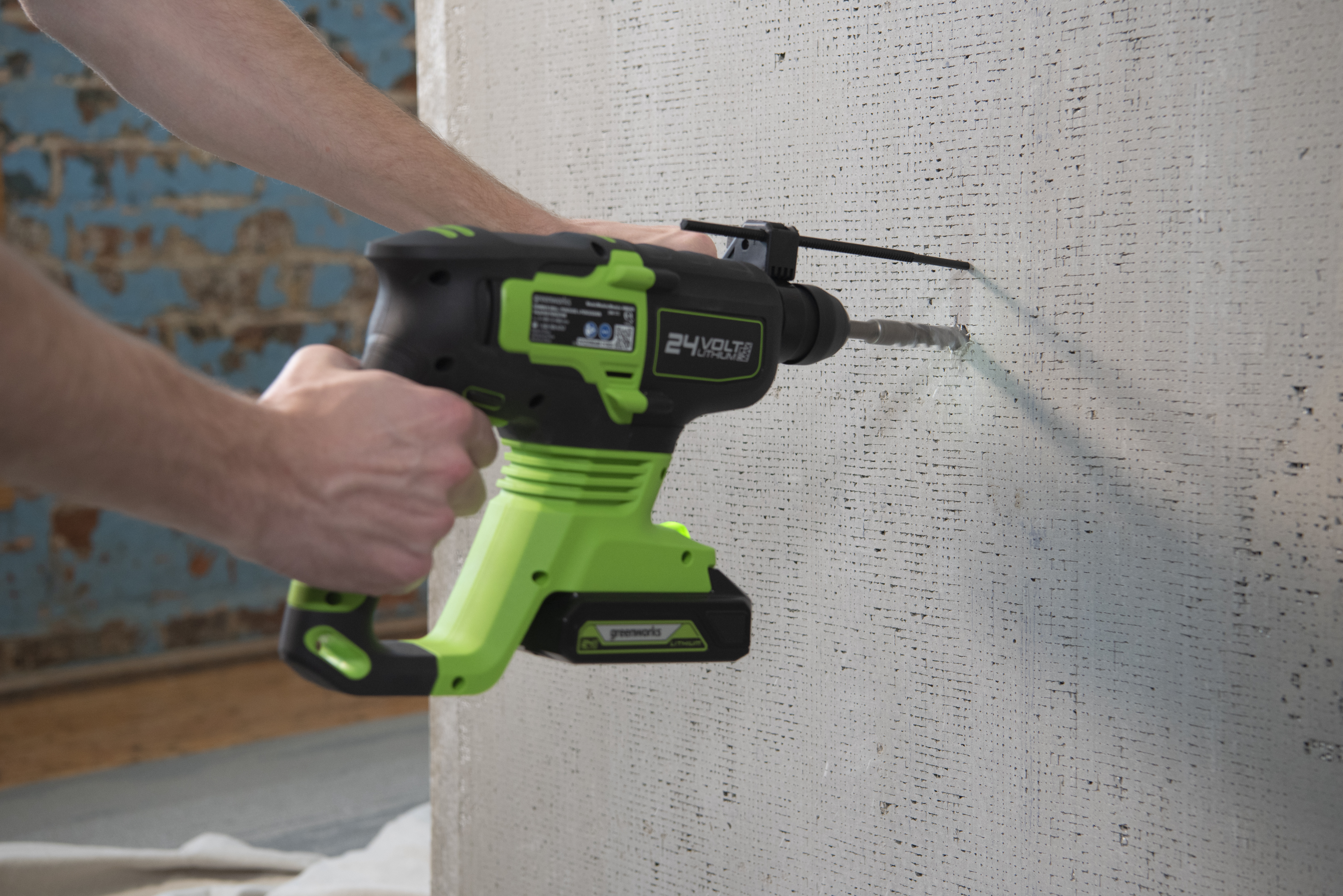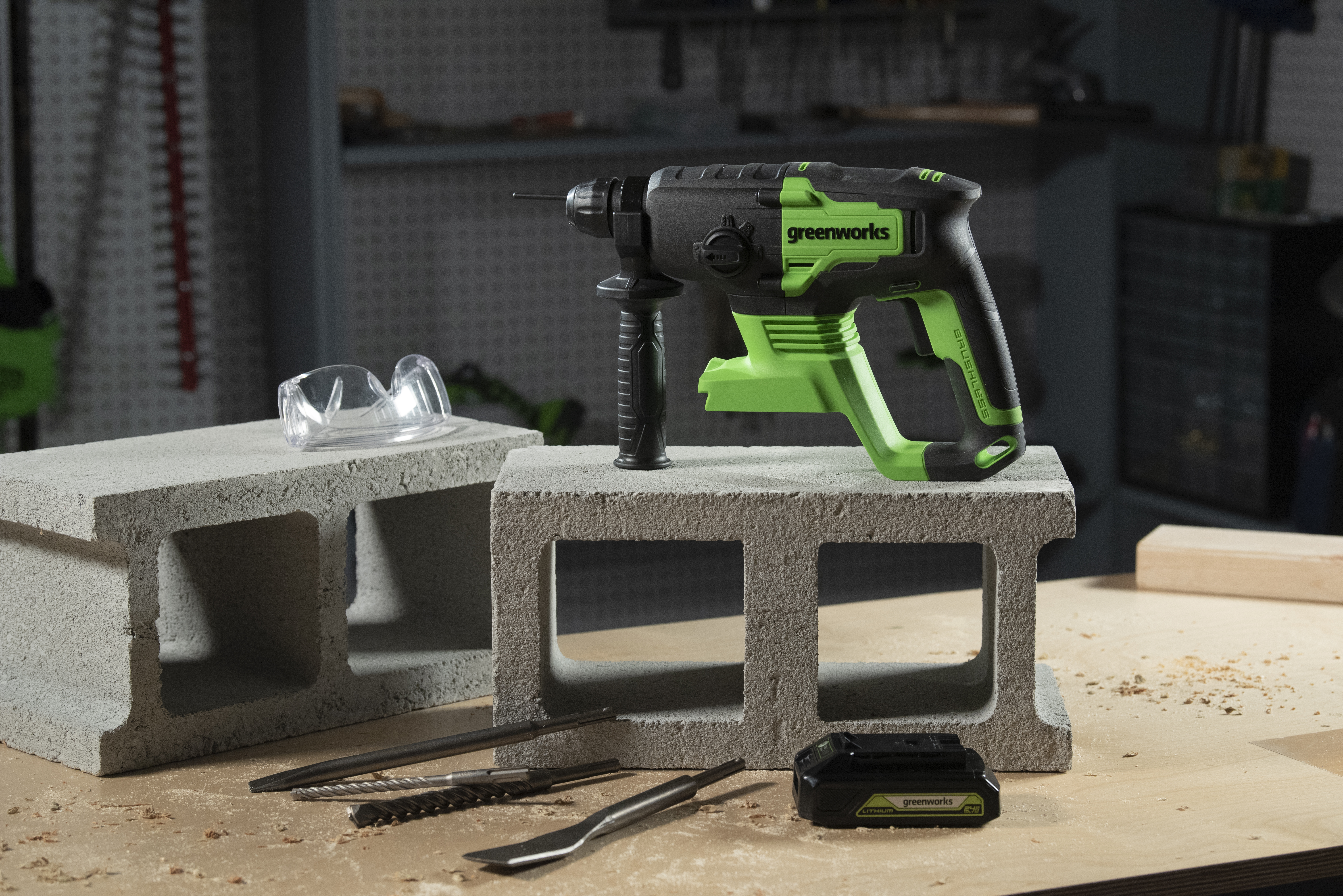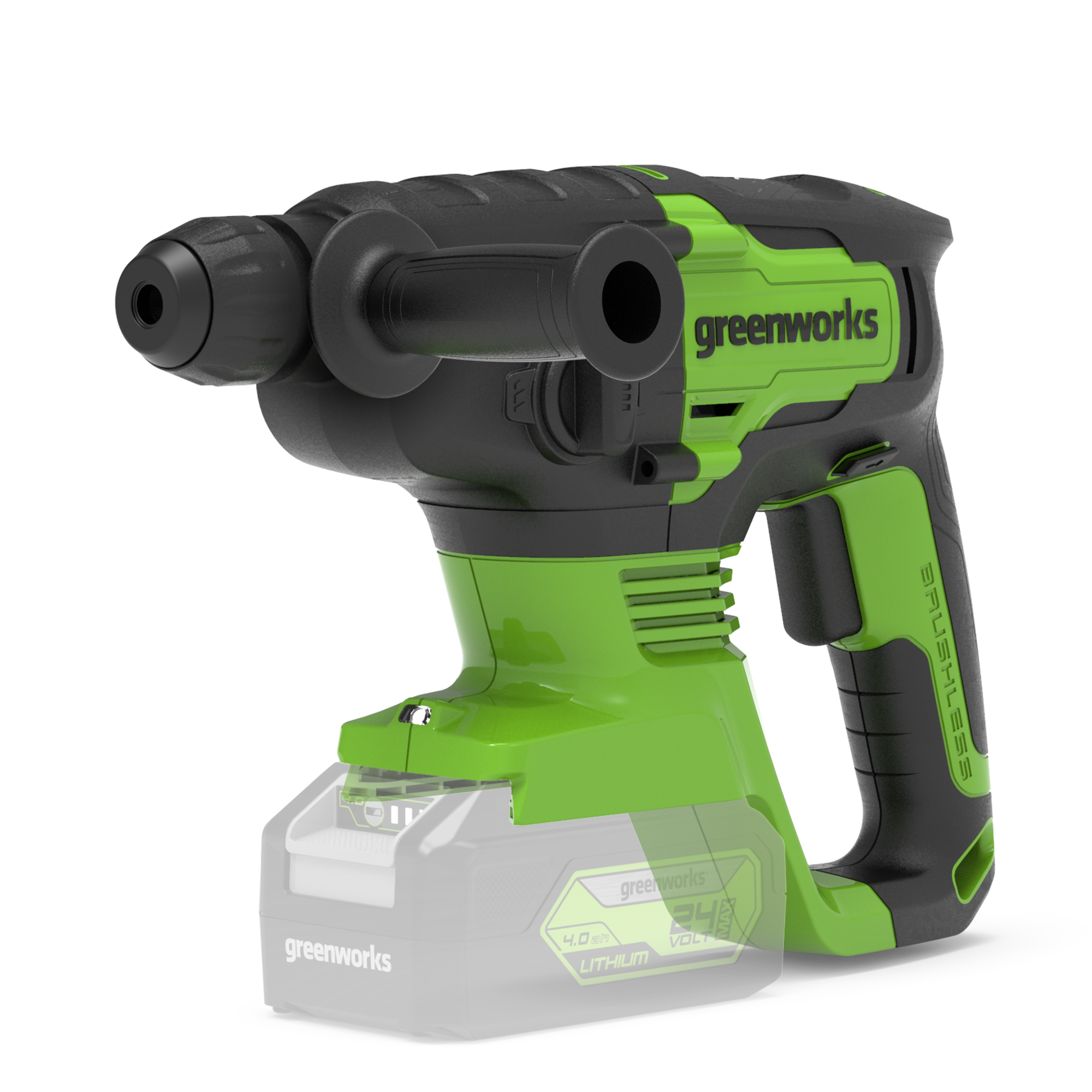 Перфоратор аккумуляторный бесщеточный Greenworks 2 ДЖ, 24V - прекрасный инструмент для проведения строительных и ремонтных работ для дома и дачи . Незаменим в местах, где отсутствует источник питания (розетка) или доступ к нему затруднен.