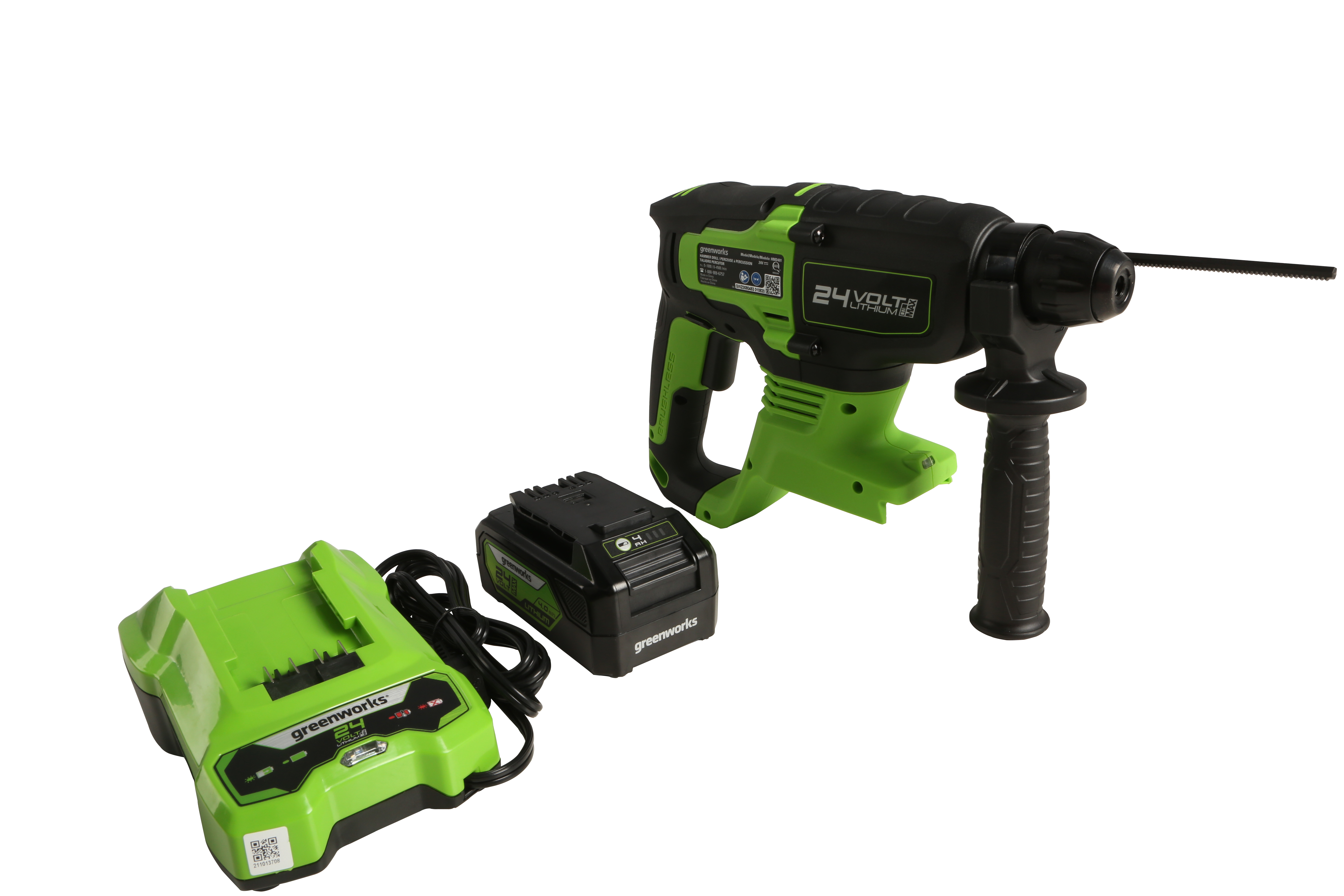 Перфоратор аккумуляторный, аккумулятор Greenworks 24V, 4Ач, зарядное устройство Greenworks 24V, 2А, удобная сумка-переноска, руководство по эксплуатации, гарантийный талон. |
