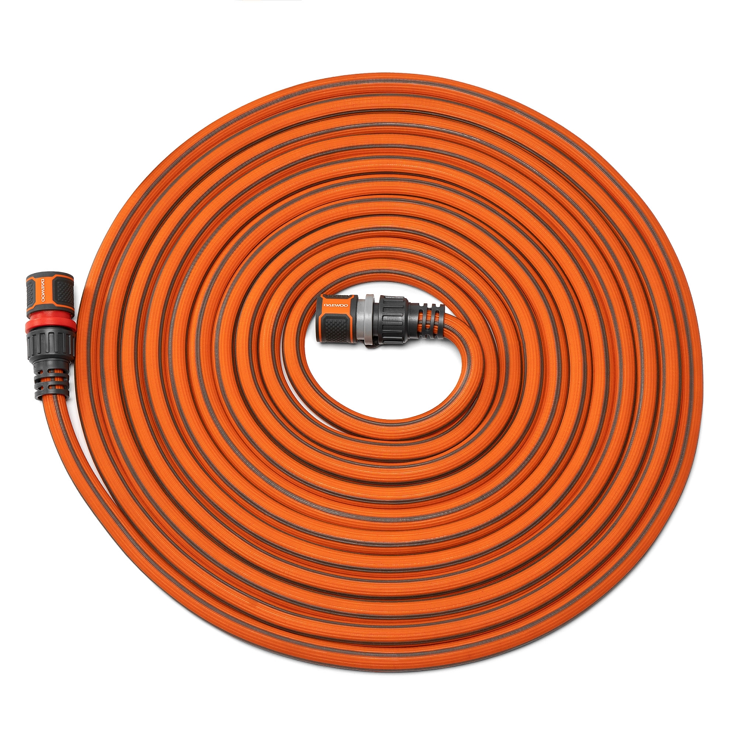 - Прочный верхний слой. Тактильно приятный внешний слой из искусственного каучука защищает шланг от воздействия окружающей среды и позволяет ему легко скользить по любой поверхности.