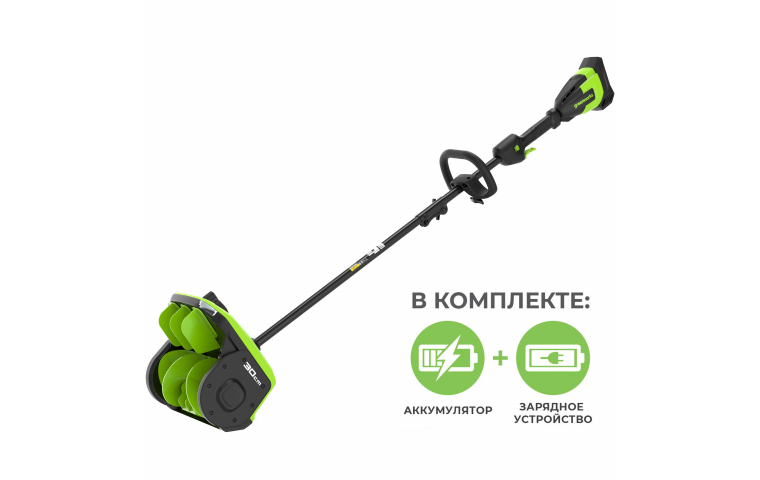 Снегоуборщик-снеголопата Greenworks GD40SS2 с регулируемым направлением выброса — лопата из серии 40В для облегчения уборки территорий от снега. Имеет ширину шнека 30 см. Оснащена бесщеточным двигателем и регулировкой выброса снега.