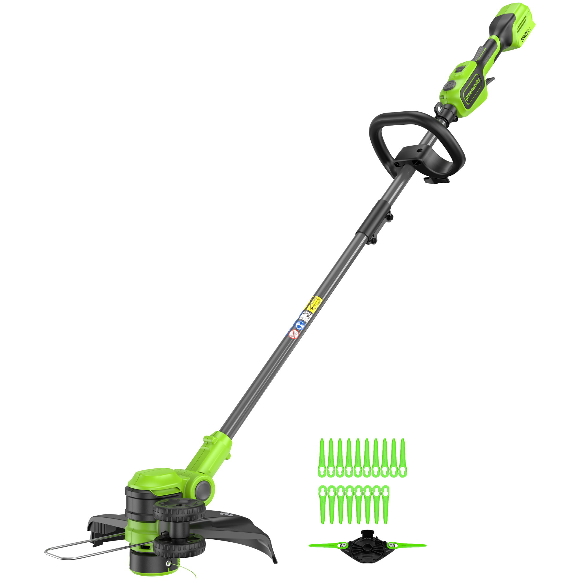 Аккумуляторный триммер Greenworks 24В GD24LT331,наплечный ремень, пластиковые ножи: 20 шт., диск для установки пластиковых ножей, руководство по эксплуатации, гарантийный талон, АКБ 4Ач - 1шт. и ЗУ. |