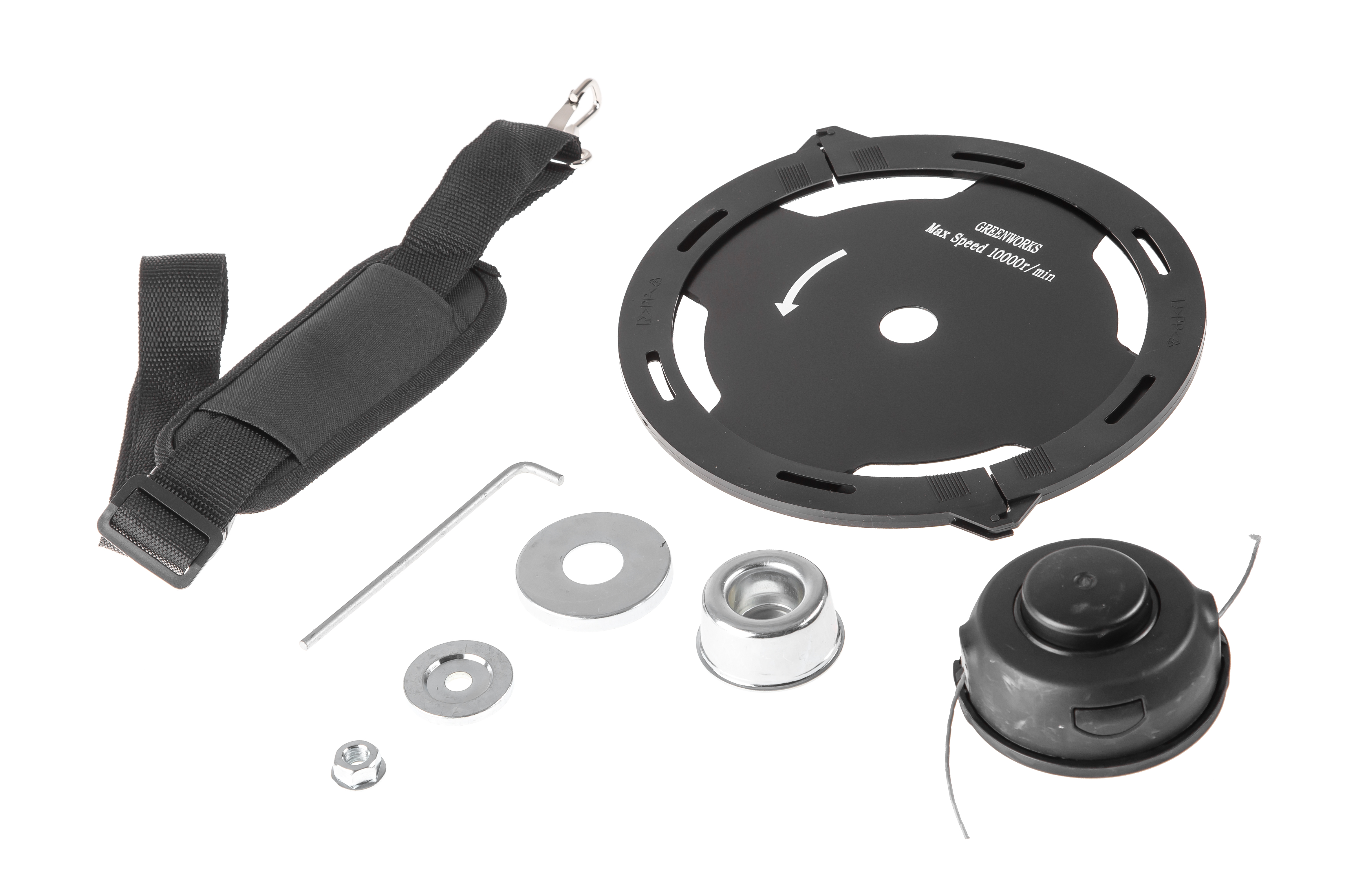 Аккумуляторный триммер, аккумулятор 40V, 4Ач, зарядное устройство 40V, 2A, режущий диск, ремень на плечо, руководство по эксплуатации, гарантийный талон. |