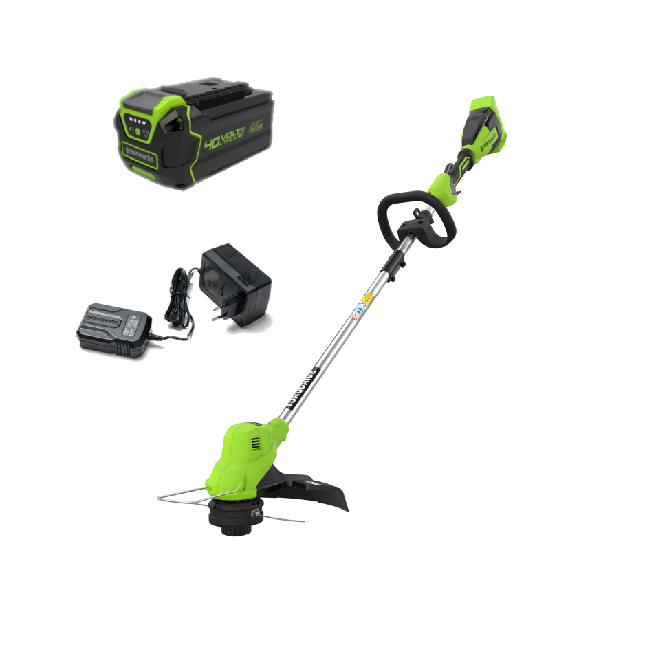 Аккумуляторный триммер Greenworks 40V; Плечевой ремень; АКБ 4Ач; Зарядное устройство. |
