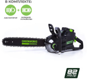 Аккумуляторная цепная пила Greenworks 82V Commercial; Аккумулятор Greenworks 82V 5 А ч - 2шт; Зарядное устройство Greenworks 82V. |